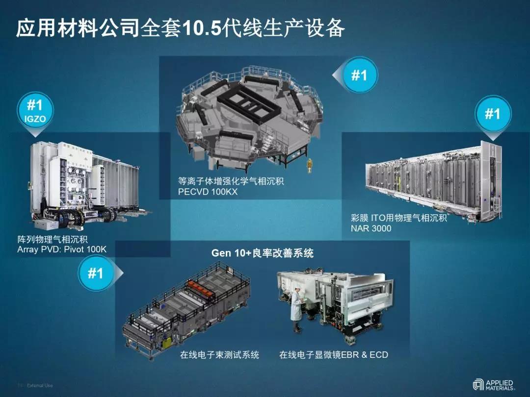 應用材料公司宣布,顯示行業龍頭企業京東方及其它面板企業都正在使用其10.5代線全套生產設備生產更逼真、更鮮明、色彩更加豐富的大尺寸電視,含最新型的超高解析度8K電視。10.5代