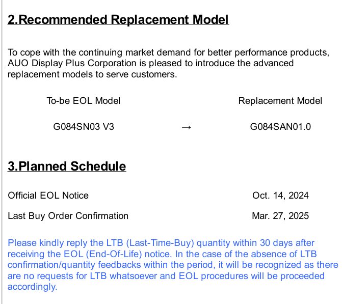為持續優化產品性能并提升客戶體驗,友達光電(AUO)將對8.4英寸液晶屏G084SN05 V9, G084SN03 V3產品線進行技術升級?,F正式通知:G084SN05 V9與G084SN03 V3型號將于2024年Q4起逐步停產,并由全新