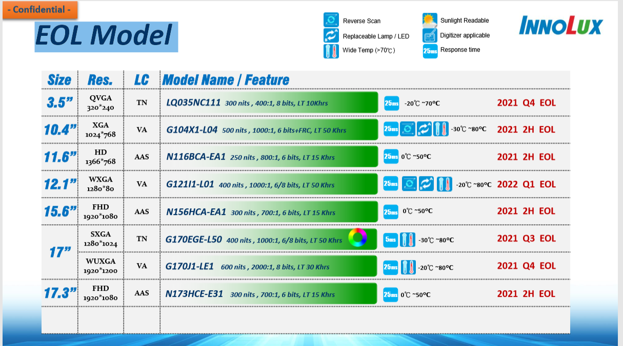 群創光電在2021年2H季度計劃即將停產的液晶屏型號,從3.5寸~17.3寸液晶屏都有部分型號預計停產。其中3.5寸LQ035NC111從2008年開始量產,目前穩定供貨10多年,LQ035NC111市場用量很大,如果產