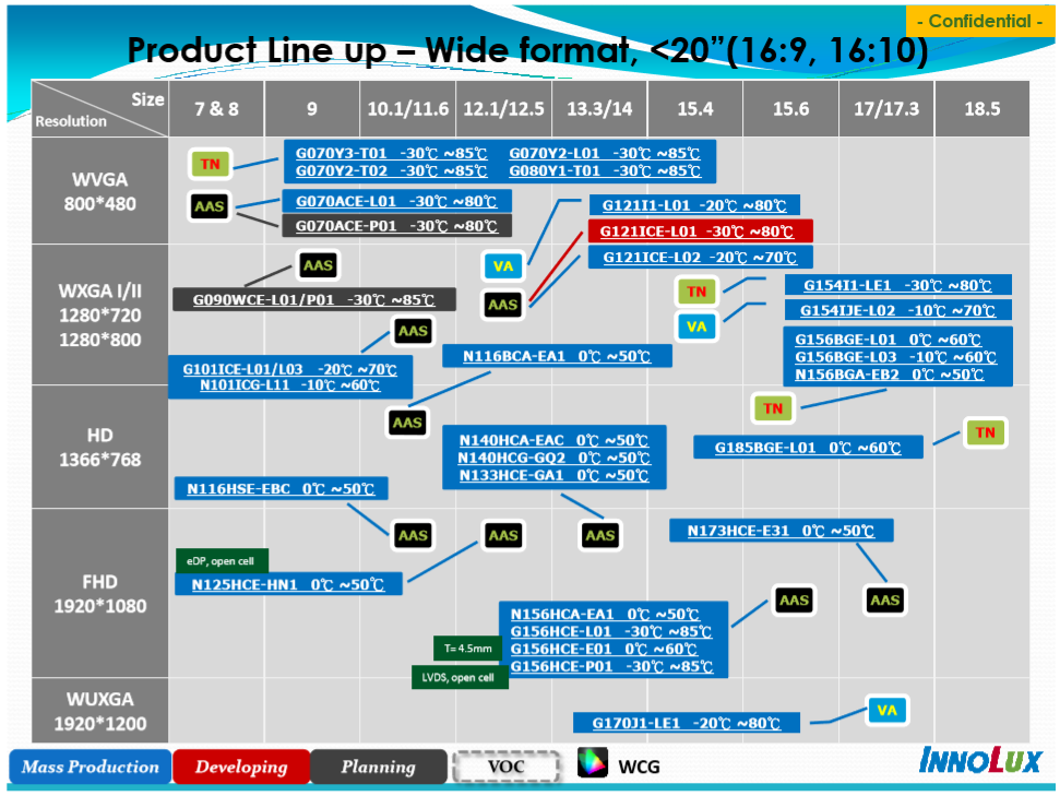 群創光電20寸以下尺寸工業液晶屏,其中寬高比在16:9和16:10比例的工業液晶屏產品有哪些,下午我們就把對應產品型號和對應工作溫度匯總出來: