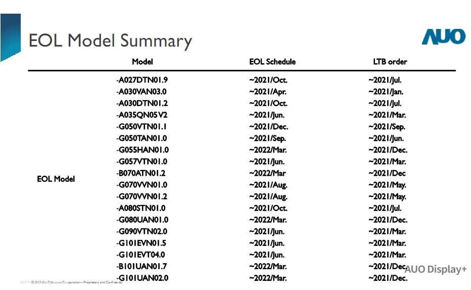 友達光電2022 Q2 Product Roadmap for EOL Model Summary