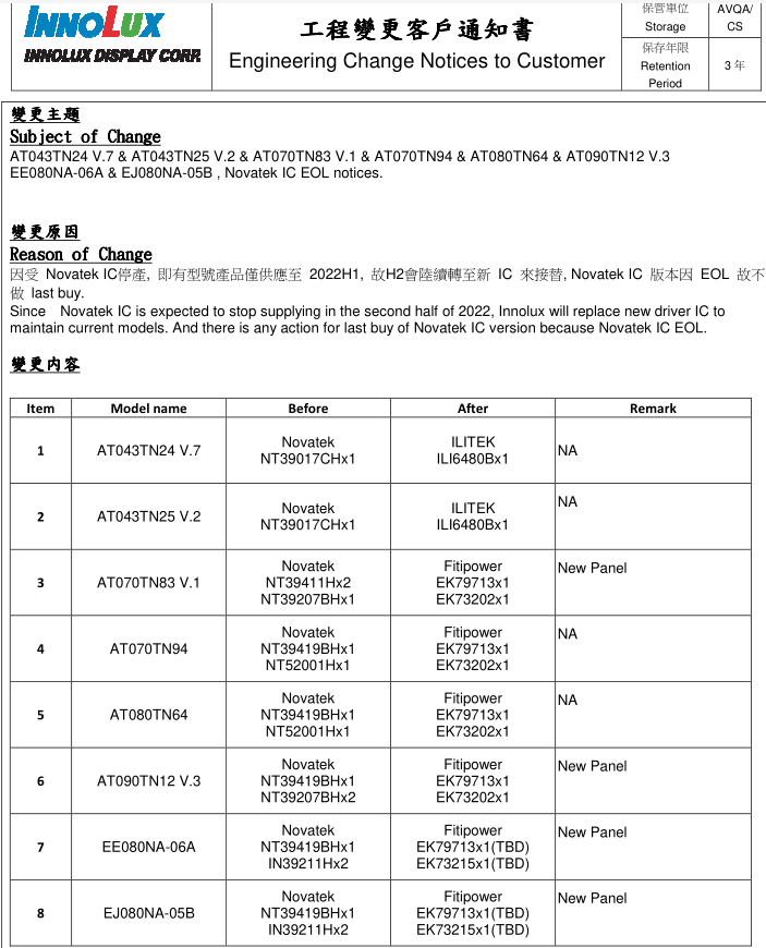 AT043TN24 V.7 & AT043TN25 V.2,AT070TN83 V.1 & AT070TN94,AT080TN64 & AT090TN12 V.3,EE080NA-06A & EJ080NA-05B,Novatek IC EOL Notices
