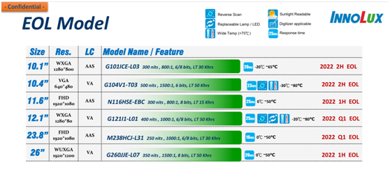 群創光電2022年EOL Model即將停產的液晶屏型號匯總